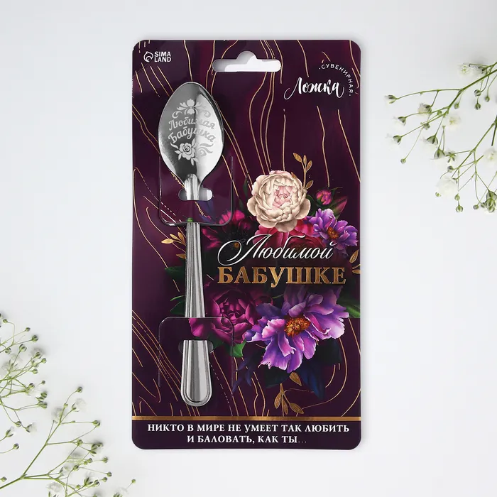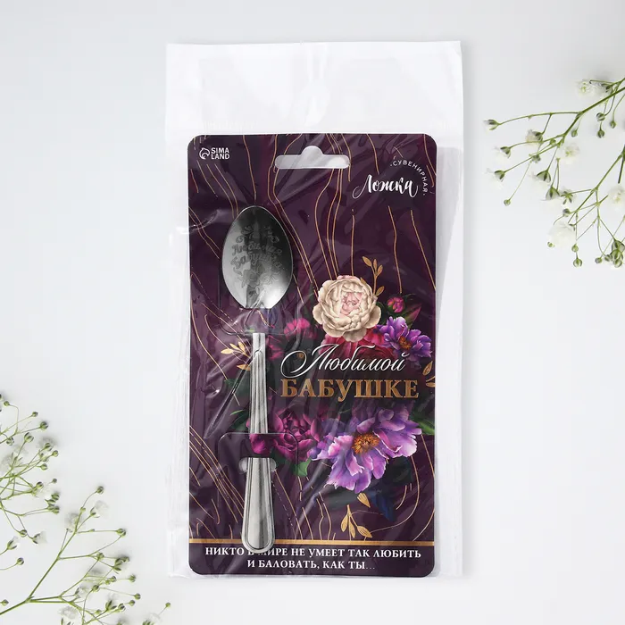 Ложка с лазерной гравировкой и изящной рукояткой преподносится на красочной открытке. На оборотной стороне изделия специально отведено место для подписи: кому и от кого был вручён подарок.