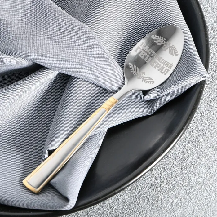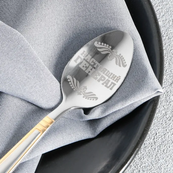 Ложка с лазерной гравировкой и изящной рукояткой преподносится на красочной открытке. На оборотной стороне изделия специально отведено место для подписи: кому и от кого был вручён подарок.