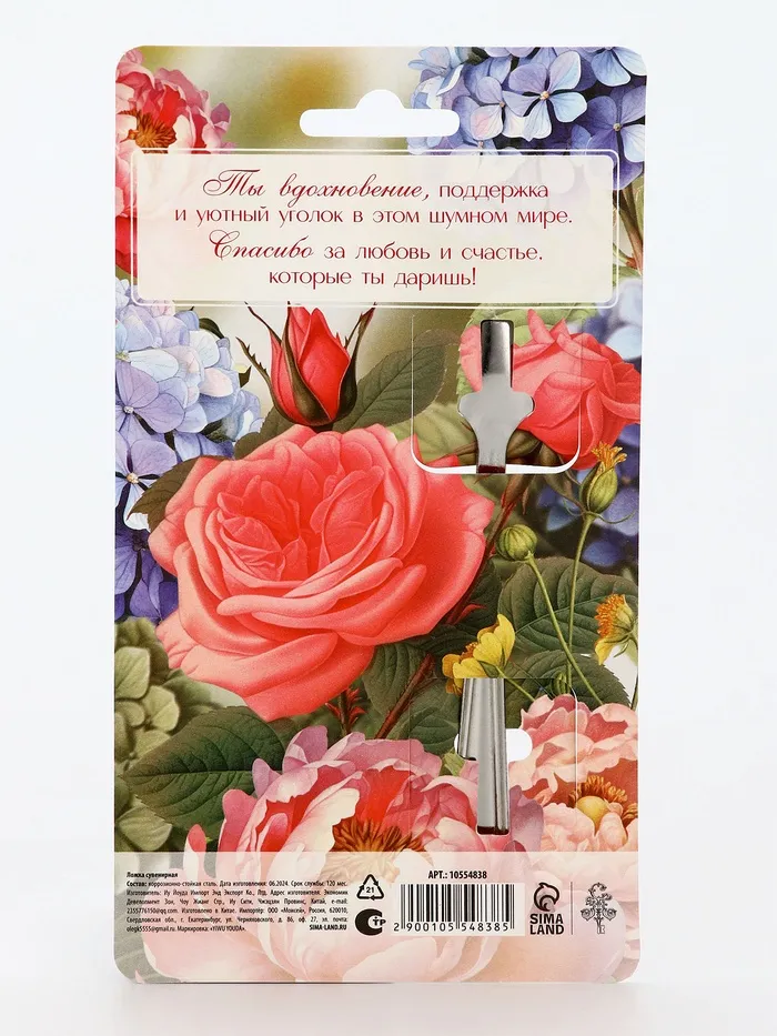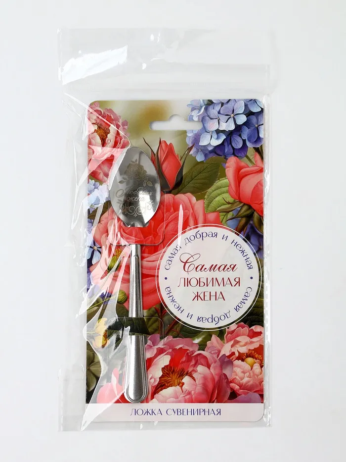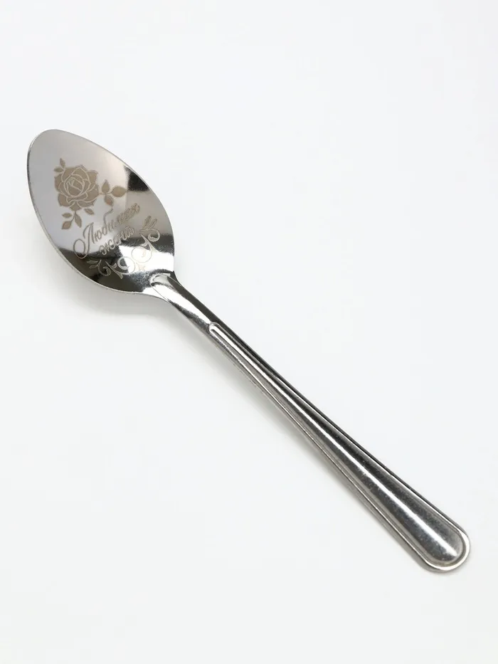 Ложка с лазерной гравировкой и изящной рукояткой преподносится на красочной открытке. На оборотной стороне изделия специально отведено место для подписи: кому и от кого был вручён подарок.