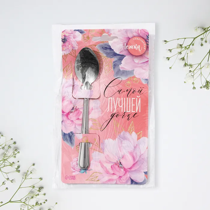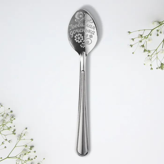 Ложка с лазерной гравировкой и изящной рукояткой преподносится на красочной открытке. На оборотной стороне изделия специально отведено место для подписи: кому и от кого был вручён подарок.