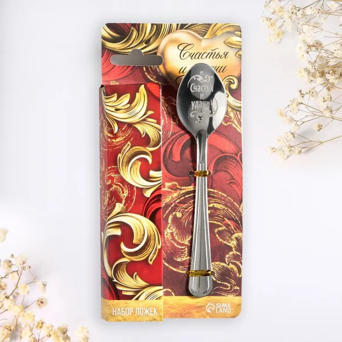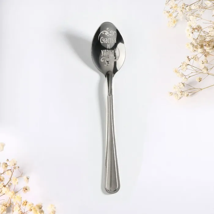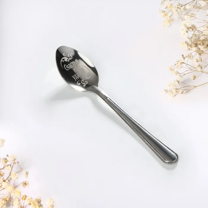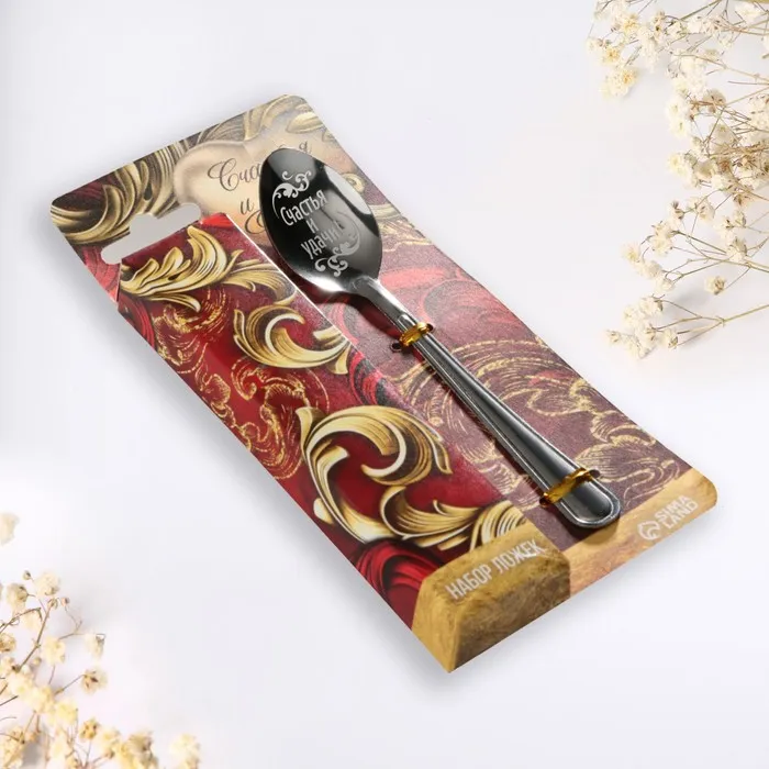 Ложка с лазерной гравировкой и изящной рукояткой преподносится на красочной открытке. На оборотной стороне изделия специально отведено место для подписи: кому и от кого был вручён подарок.