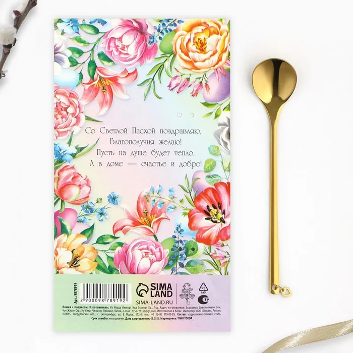 Пасхальная чайная ложка - это креативный и оригинальный предмет для приготовления и подачи чая во время пасхальных праздников. Ложка украшена подвесом, что делает её привлекательной при сервировки праздничного стола на пасхальные праздники. Ложка станет отличным подарком или знаком внимания для родных и близких людей. Если у вас или ваших близких есть коллекция посуды или пасхальных украшений, пасхальная чайная ложка может стать прекрасным дополнением к этой коллекции. Использование пасхальных чайных ложек может стать традицией, которая добавит волшебства к пасхальным утрам или часам чаепития во время праздника.