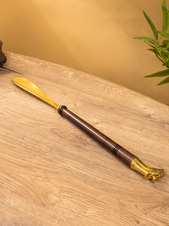 Ложка для обуви с фигурой дельфина — практичный аксессуар для бережного ухода за обувью. Длина 49 см позволяет использовать ее без наклонов. Латунная основа с деревянными вставками сочетает прочность с эстетикой.