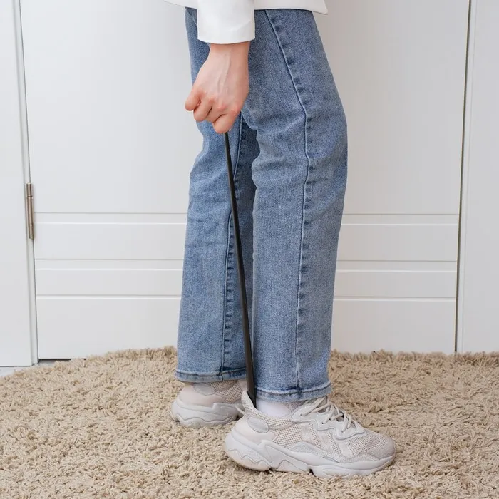 - Вставьте длинный рожок для обуви в задник и медленно опускайте стопу в ботинок. Это поможет избежать натирания и их деформации, а также значительно сэкономит ваше время.