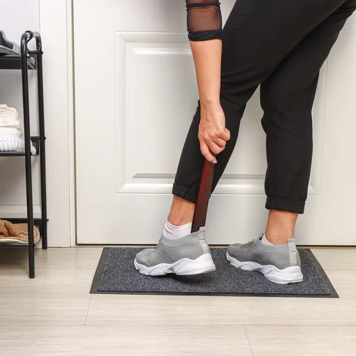 - Использовать ложку для обуви очень просто! Расшнуруйте или расстегните молнию. Вставьте длинный рожок для обуви в задник и медленно опускайте стопу в ботинок. Это поможет избежать натирания и их деформации, а также значительно сэкономит ваше время.