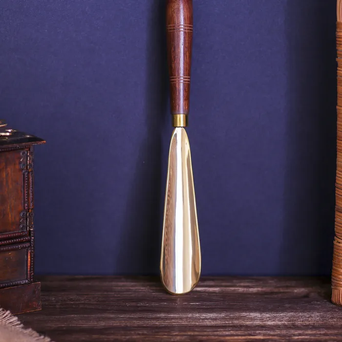 Представьте себе аксессуар, который не только облегчит вашу повседневную жизнь, но и добавит нотку элегантности в ваш дом. Этот инструмент, выполненный из высококачественной латуни, станет вашим надежным помощником в уходе за обувью. Его золотистый оттенок подчеркнет ваш вкус и стиль, а продуманная форма обеспечит удобство в использовании.