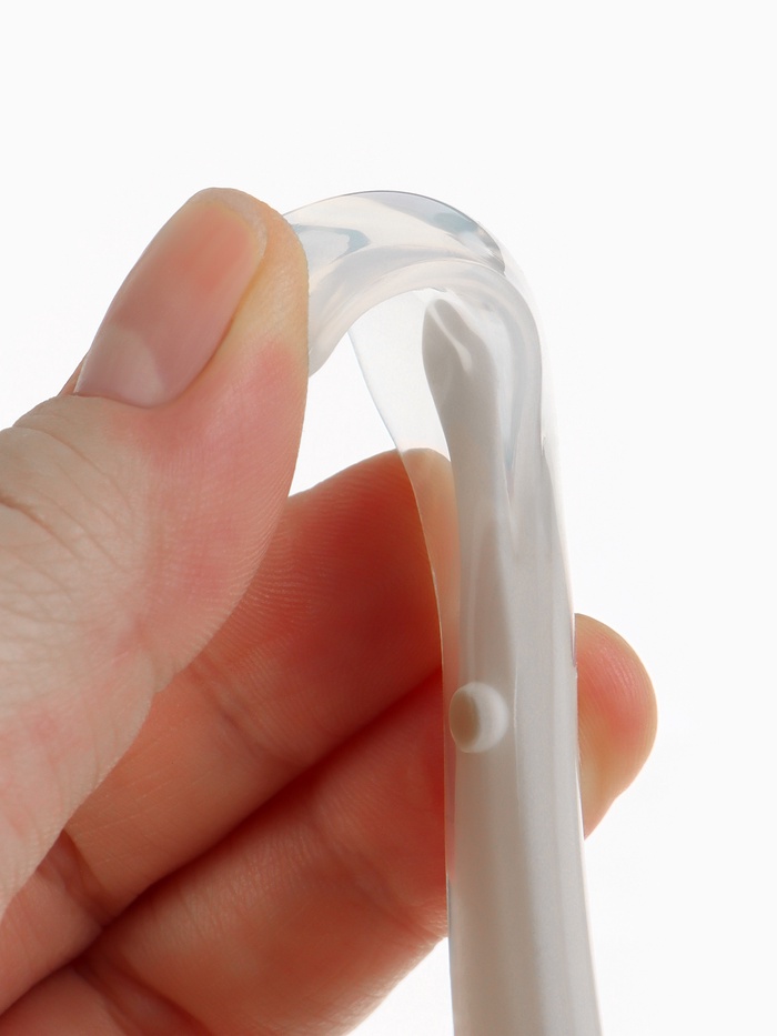 - Мягкий кончик из силикона бережно касается дёсен, исключая риск травмирования, что особенно важно для малышей, у которых режутся зубы.