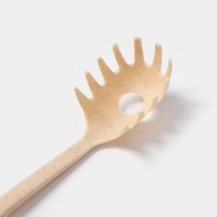 Ложка для спагетти — это один из незаменимых столовых приборов на кухне. Благодаря её зубчикам по краям спагетти не скатываются с ложки и не ломаются. А лишняя жидкость стекает через небольшое отверстие. Также ложкой для спагетти удобно не только насыпать, но и перемешивать еду во время готовки.