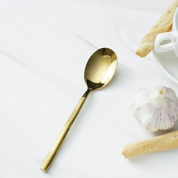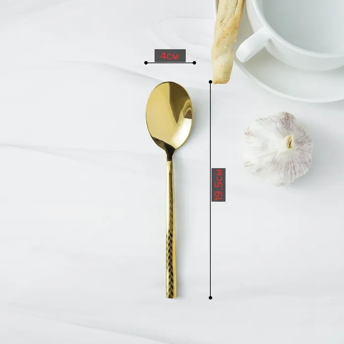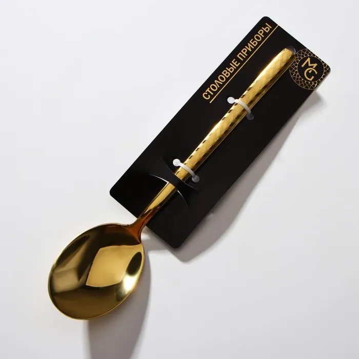 Столовая ложка из высококачественной нержавеющей стали золотого цвета - идеальный выбор для праздничных сервировок и особенных случаев. Она имеет современный дизайн и зеркальную полировку, что придает ей элегантный и стильный вид.