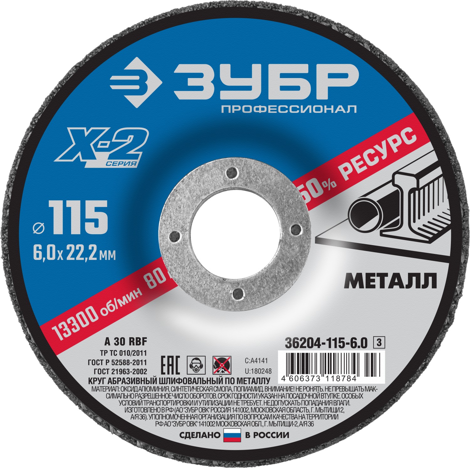 ЗУБР Х-2, 115 х 6 х 22.2 мм, для УШМ, шлифовальный круг по металлу, Профессионал (36204-115-6.0)