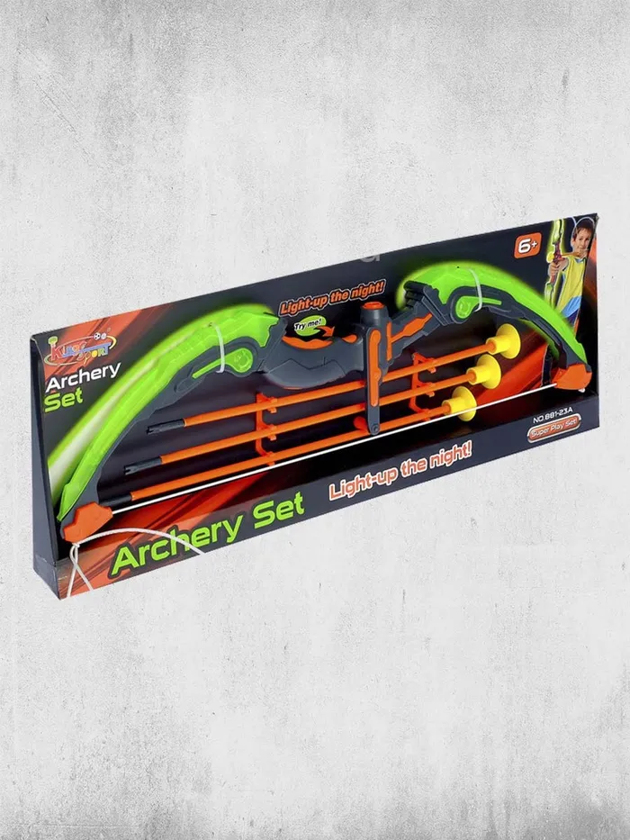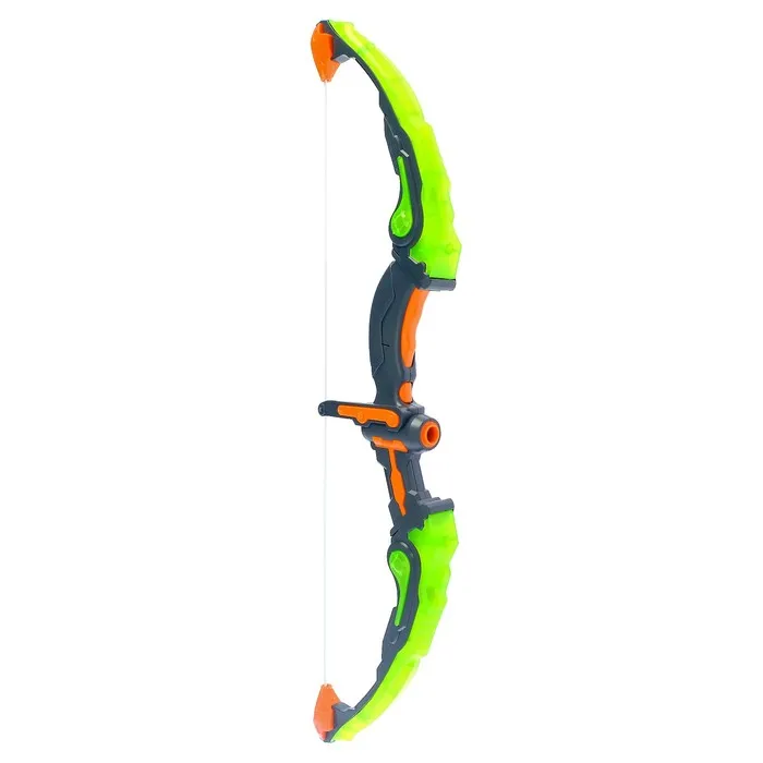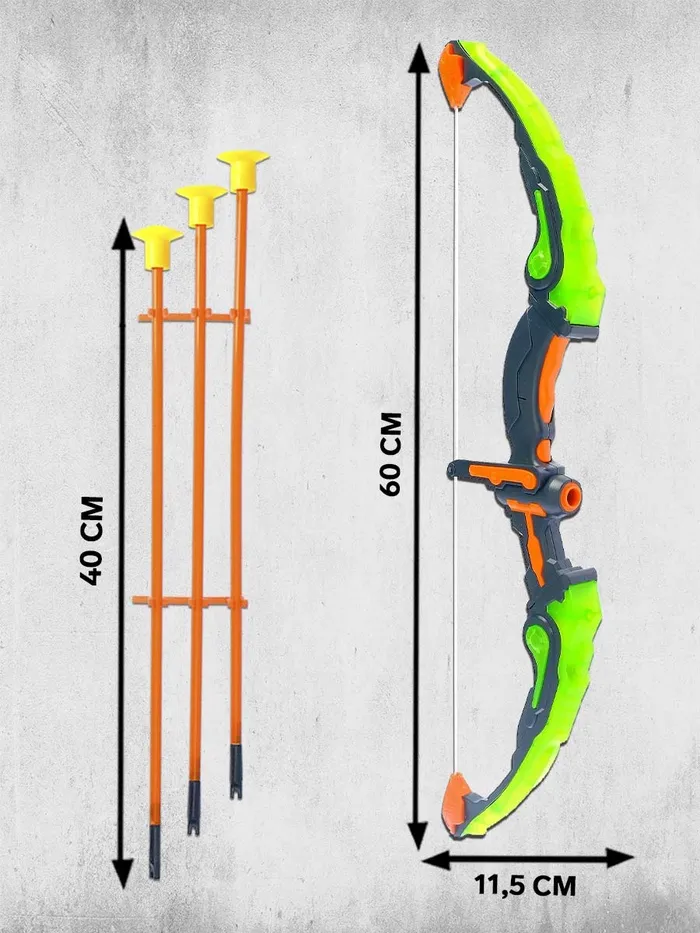 Размер лука: 60 × 11,5 × 2,7 см.Светящиеся элементы: лук и стрелы будут освещать твой путь ночью.Дальность стрельбы — 15 метров.В комплекте 3 стрелы с присосками, что даёт ребёнку целых три попытки стрельнуть прямо в цель!Лук изготовлен из безопасного и высококачественного пластика.Предназначен для детей от 6 лет.