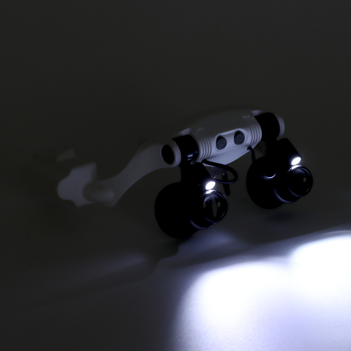 Лупа оснащена подсветкой, которая обеспечивает яркое и равномерное освещение осматриваемого объекта, облегчая работу в условиях недостаточной освещённости. Лампочки подсветки расположены над окулярами, при этом левая и правая включаются и выключаются по отдельности по одному нажатию по кнопке в центре устройства. Подсветка работает от двух батареек типа ААА, отсек для них находится на правой дужке устройства.