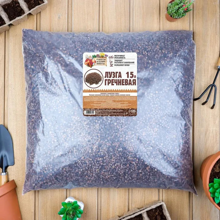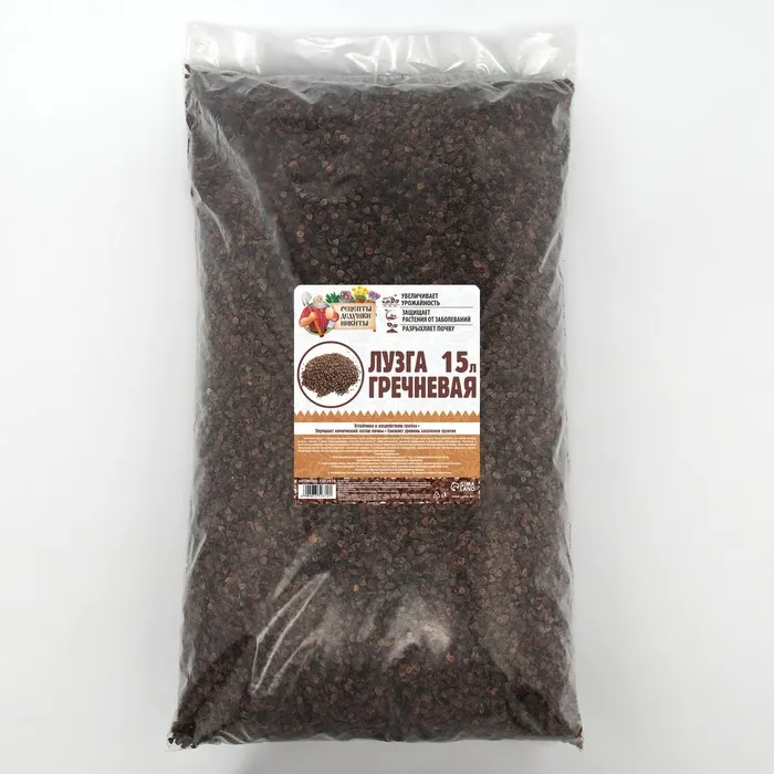 Полезное экологически чистое удобрение для участка. В своем составе лузга имеет такие элементы, как калий, фосфор, железо, магний и цинк, увеличивающие стрессоустойчивость и сопротивляемость растений грибковым и микробным заболеваниям. Вкусовые и питательные качества гречишной лузги привлекают дождевых червей, которые оказывают благоприятное влияние на плодородный слой почвы. Мульчирование гречишной лузгой позволяет сократить количество поливов и уменьшить колебания суточной температуры. Гречишная лузга позволяет снизить кислотность почвы, так как в процессе ее разложения происходит щелочная реакция.