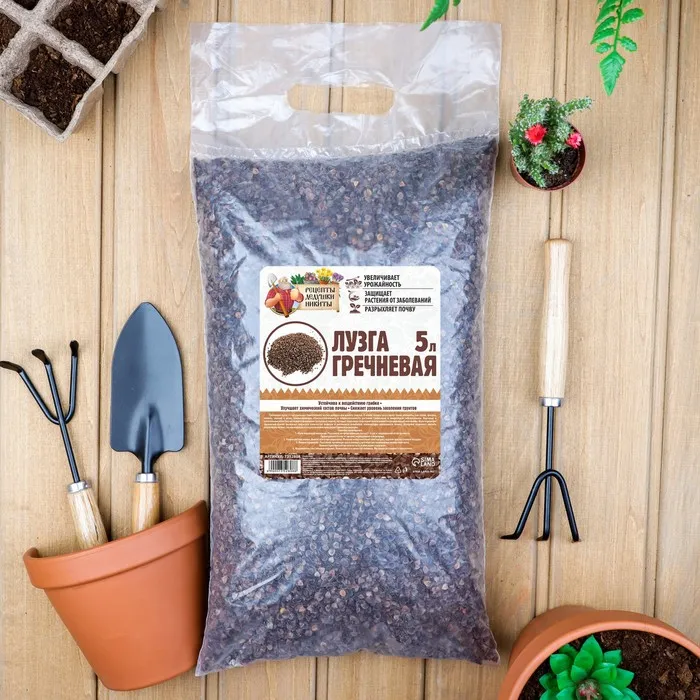 Полезное экологически чистое удобрение для участка. В своем составе лузга имеет такие элементы, как калий, фосфор, железо, магний и цинк, увеличивающие стрессоустойчивость и сопротивляемость растений грибковым и микробным заболеваниям. Вкусовые и питательные качества гречишной лузги привлекают дождевых червей, которые оказывают благоприятное влияние на плодородный слой почвы. Мульчирование гречишной лузгой позволяет сократить количество поливов и уменьшить колебания суточной температуры. Гречишная лузга позволяет снизить кислотность почвы, так как в процессе ее разложения происходит щелочная реакция.