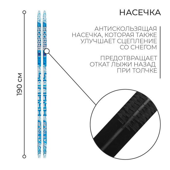Комфорт и удобство использования, его обеспечивает антискользящая насечка, которая также улучшает сцепление со снегом.