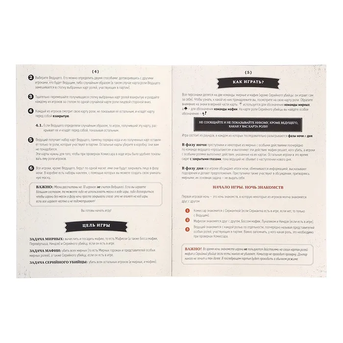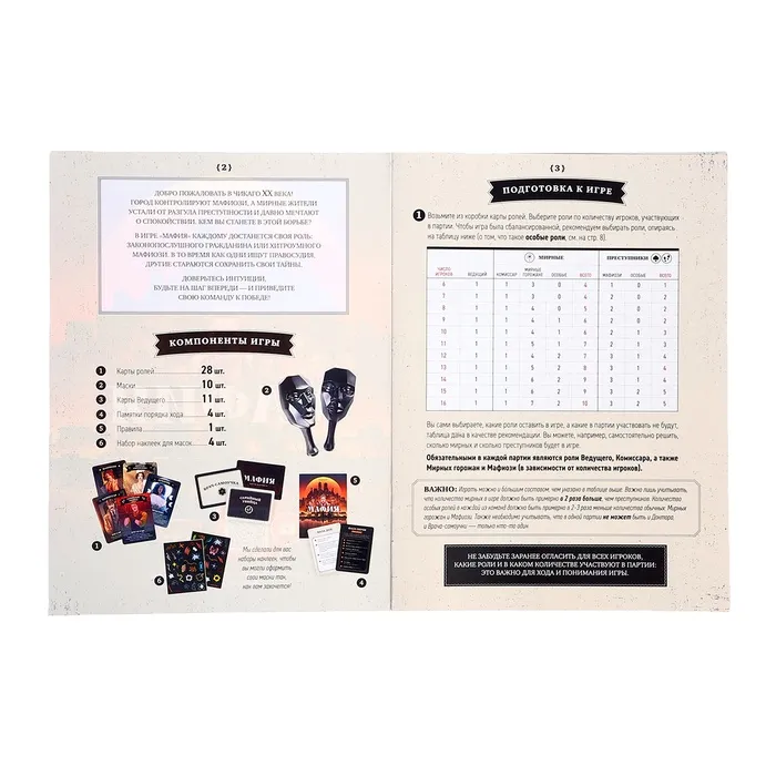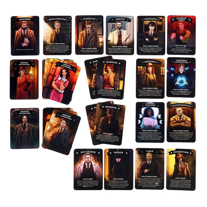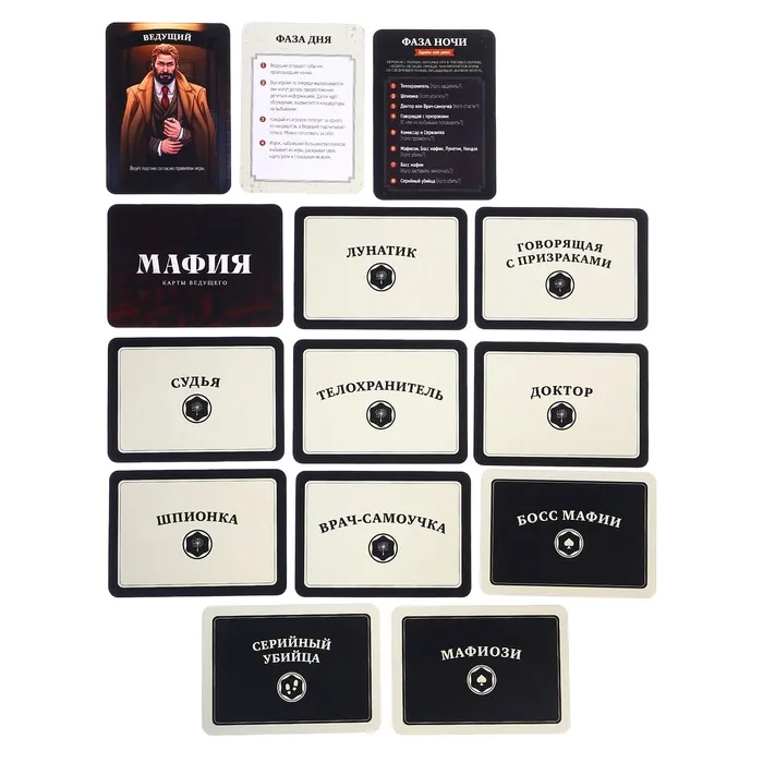 - Профессиональная комплектация — 28 карт ролей, 11 карт ведущего, блокнот для заметок и подсказки. Всё продумано для удобства игры даже новичкам.