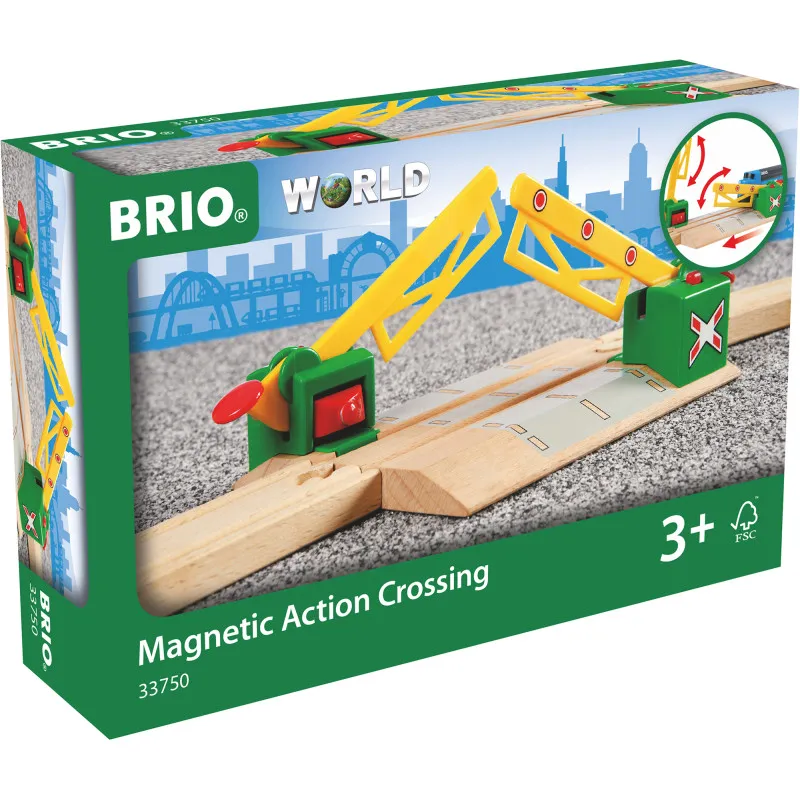 Brio-мaгнитный перекресток 33750 – это увлекательное дополнение к железнодорожным играм Brio. Когда поезд подъезжает к перекрестку, дорожное движение останавливается за шлагбаумом. Шлагбаум опускается автоматически благодаря магнетизму, который распознает приближающийся поезд.