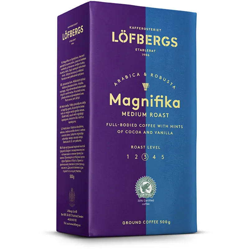 Легко обжаренный кофе Magnifika от Löfbergs – это сбалансированный напиток, в котором можно уловить приятные оттенки какао. Смесь Magnifika состоит из тщательно отобранных арабика-бобов из Южной и Центральной Америки, Восточной Африки и Азии. Полнота, ароматы какао и умеренная кислотность делают Magnifika прекрасным спутником для каждого кофейного момента.