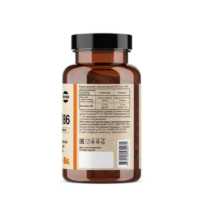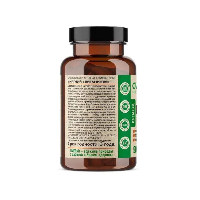 Магний В6 от OVERvit содержится в биодоступной форме - магний цитрат. Форма цитрат хорошо усваивается и хорошо переносится ЖКТ. Специалисты рекомендуют принимать магний вместе с витаминами группы B и D. Магний витамины OVERvit содержится в составе с пиридоксином - витамин В6 - для лучшего усвоения магния в организме.