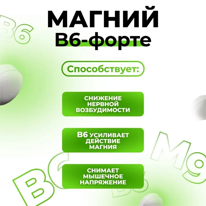Витамин В6 участвует во многих метаболических процессах, в регуляции метаболизма нервной системы. Витамина В6 улучшает всасывание магния из желудочно-кишечного тракта и его проникновение в клетки.