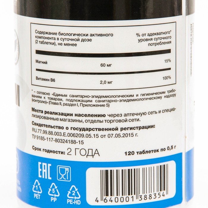 Состав: магния цитрат - 735 мг (в том числе магний – 115 мг), микрокристаллическая целлюлоза (носитель), оболочка таблетки (пленочная оболочка (поливиниловый спирт (глазирователь), тальк (антислеживающий агент), полиэтиленгликоль (стабилизатор), твин-80 (эмульгатор), диоксид титана (краситель); кальциевая/магниевая соль стеариновой китслоты (агент антислеживающий), аэросил (кремния диоксид, агент антислеживающий), витамин В6 (пиридоксина гидрохлорид) – 1,5 мг.