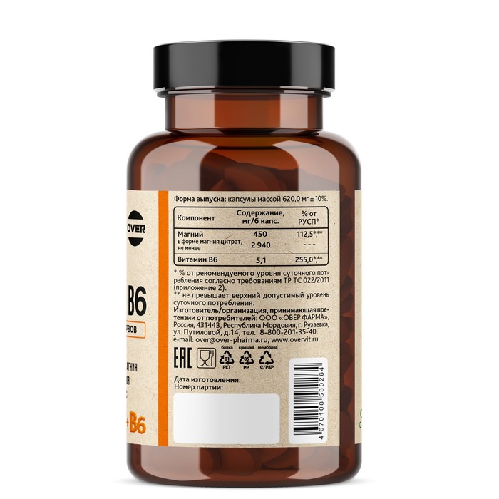 6 капсул (суточная дозировка) содержат: магний - 450 мг; витамин В6 - 5,1 мг.