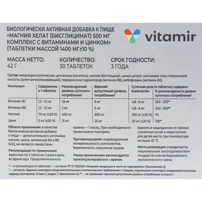 «Магния хелат (бисглицинат) 500 мг комплекс с витаминами и цинком» - биологически активная добавка к пище, дополнительный источник магния в легкодоступной форме, цинка и витаминов В2 и В6. Эти составляющие способствуют снятию мышечного напряжения, нормальной работе сердечно-сосудистой и нервной систем, а также необходимы для нормального сна.
