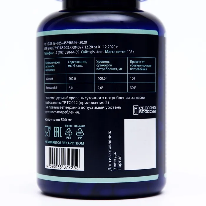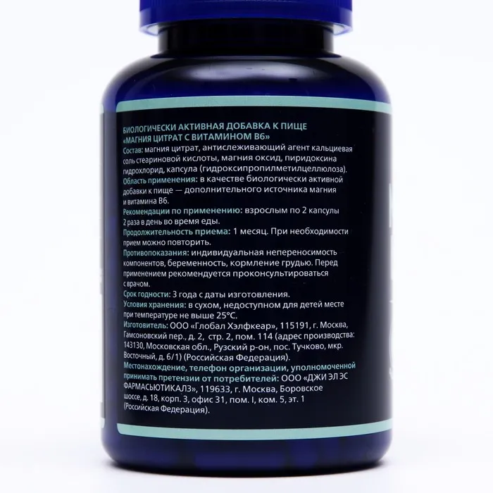 Состав: 4 вегетарианские капсулы (суточная доза) содержат: магния цитрат 1000 мг, магния оксид 480 мг (в том числе магния 400 мг), пиридоксина гидрохлорид (Витамин В6) 6 мг.