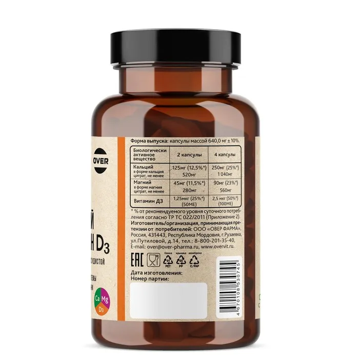 4 капсулы (суточная доза: содержат: кальций - 250 мг, в форме кальция цитрата - 1 200 мг; магний - 90 мг, в форме магния цитрата - 540 мг; Витамин D3 - 2,5 мкг, в форме холекальциферола - 0,92 мг.