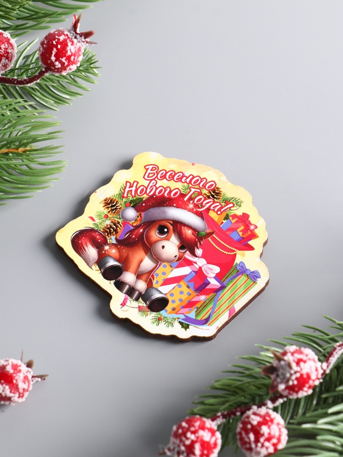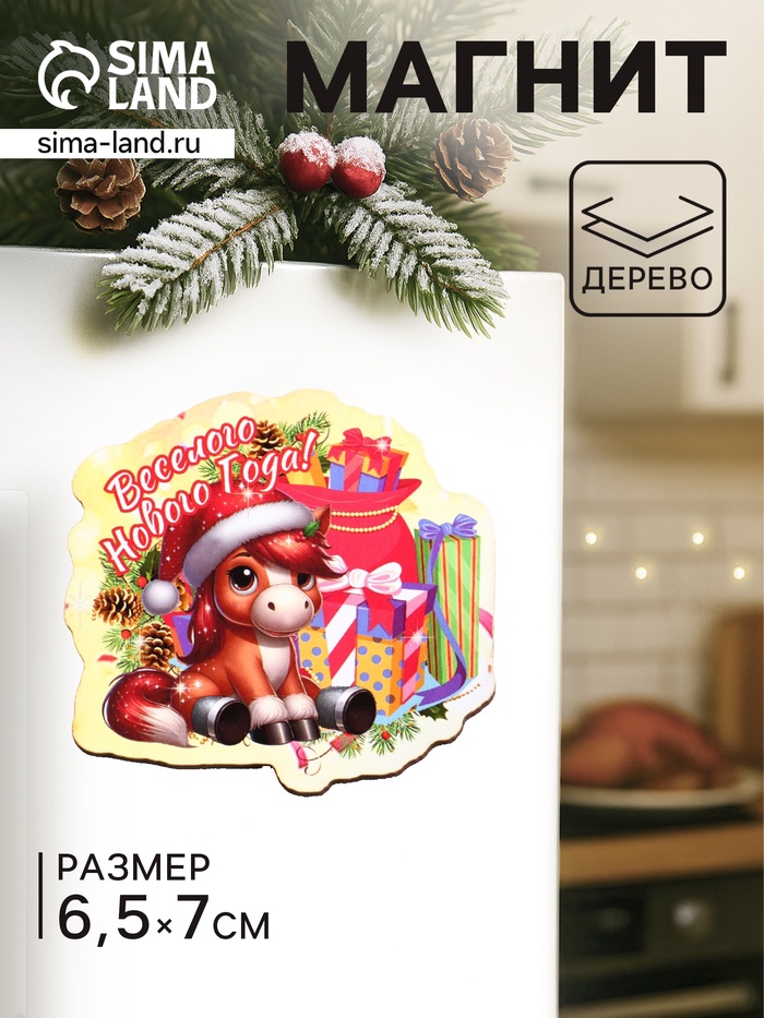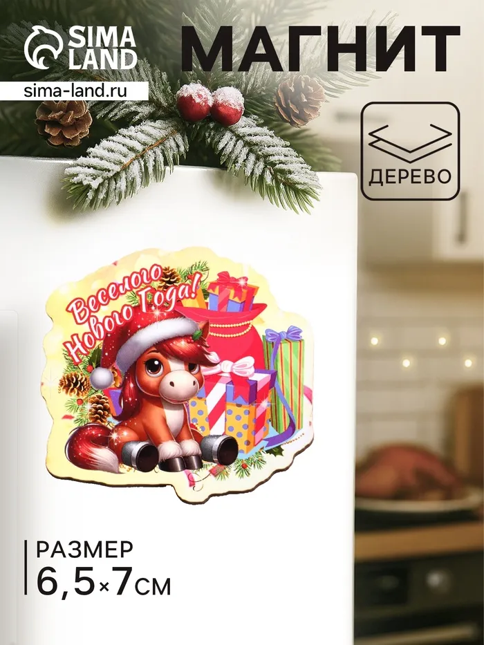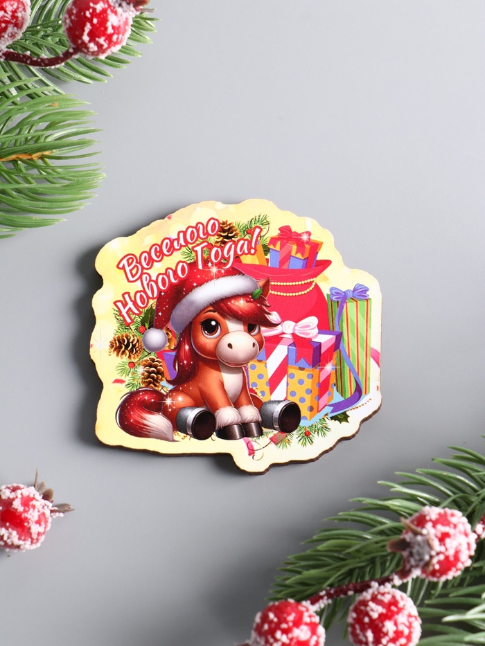 Подарите любимым символ года – магнит с изображением лошадки, которая желает «Весёлого Нового года». Это очаровательное дополнение для вашего холодильника добавит праздничного настроения и станет отличным украшением для дома. Яркий акцент на вашей кухне придаст уникальность вашему интерьеру в новогодние праздники.