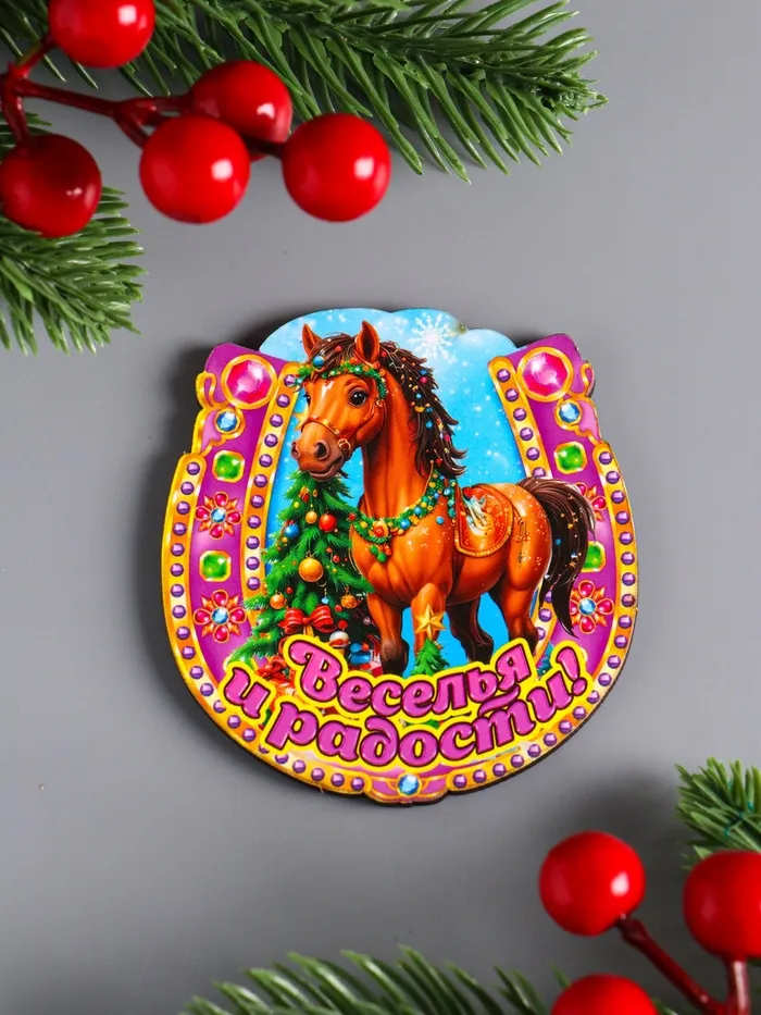 Магнит на холодильник «Новогодняя подкова с конём. Веселья и радости», 7×7 см — Характеристики
