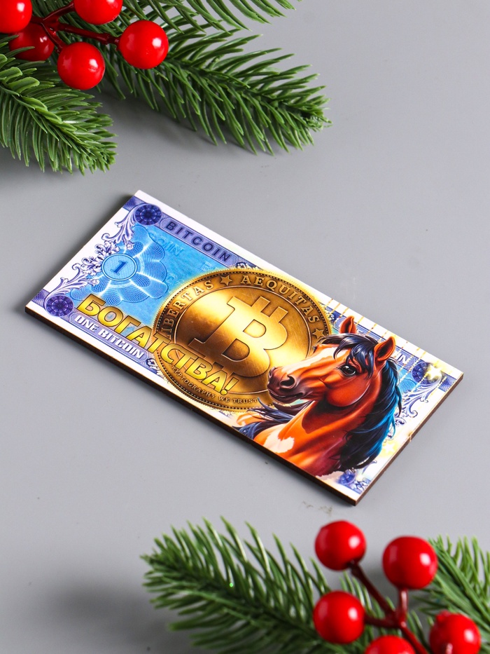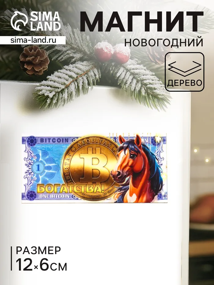 Магнит на холодильник «Новогодний конь на купюре Биткоин» 12×6 см — Характеристики