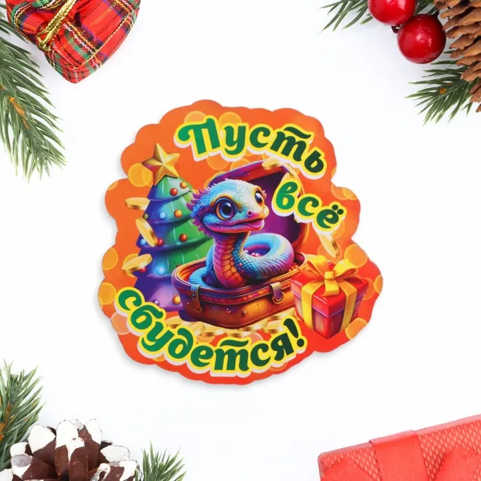 Новогодний магнит с изображением змеи — символа 2025 года — станет ярким акцентом на вашем холодильнике и талисманом, привлекающим удачу. Изготовленный из натуральной фанеры, он сочетает в себе экологичность, прочность и приятную текстуру. Надпись «Пусть всё сбудется!» добавляет аксессуару позитивный настрой, напоминая о важности веры в лучшее.
