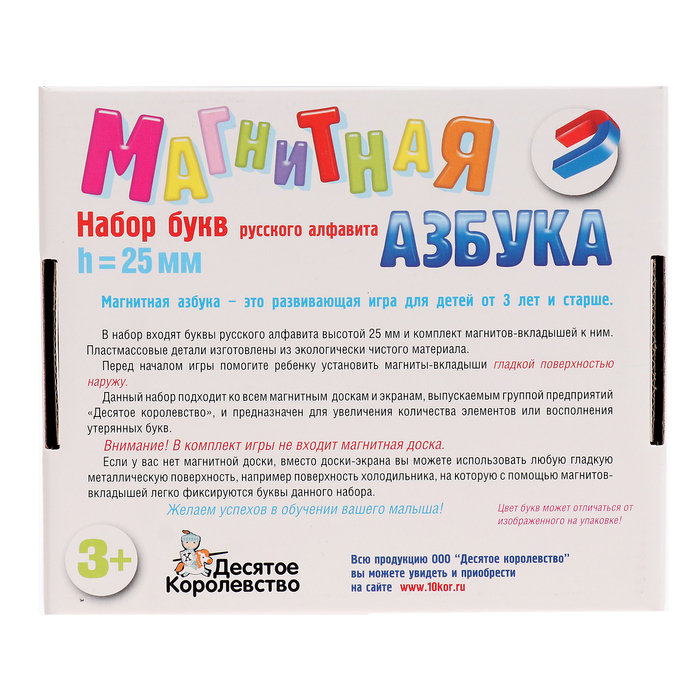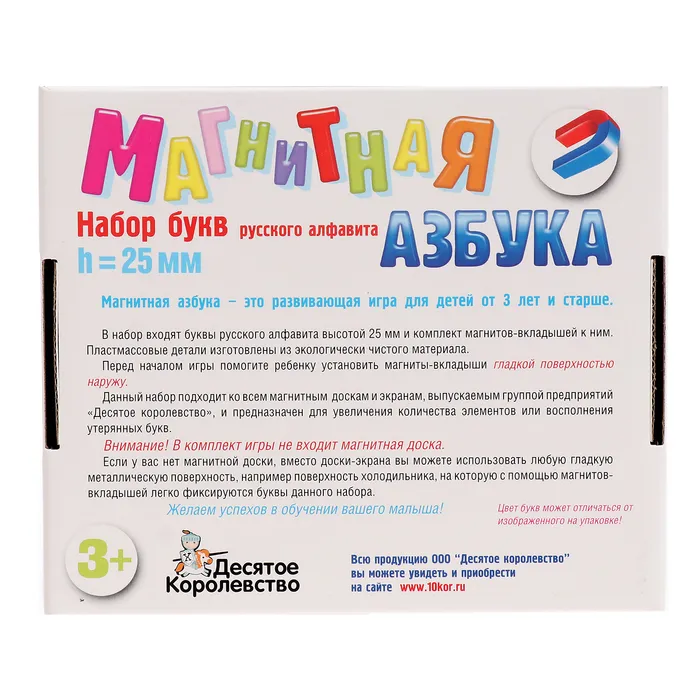 «Магнитная азбука» — вспомогательный материал для начального обучения грамоте детей дошкольного возраста. Она состоит из 106 русских буковок высотой 2,5 см каждая. Элементы набора хорошо крепятся к любой металлической поверхности. Они подойдут для различных планшетов, экранов или холодильников дома. Устанавливайте магниты-вкладыши в буквы самостоятельно.