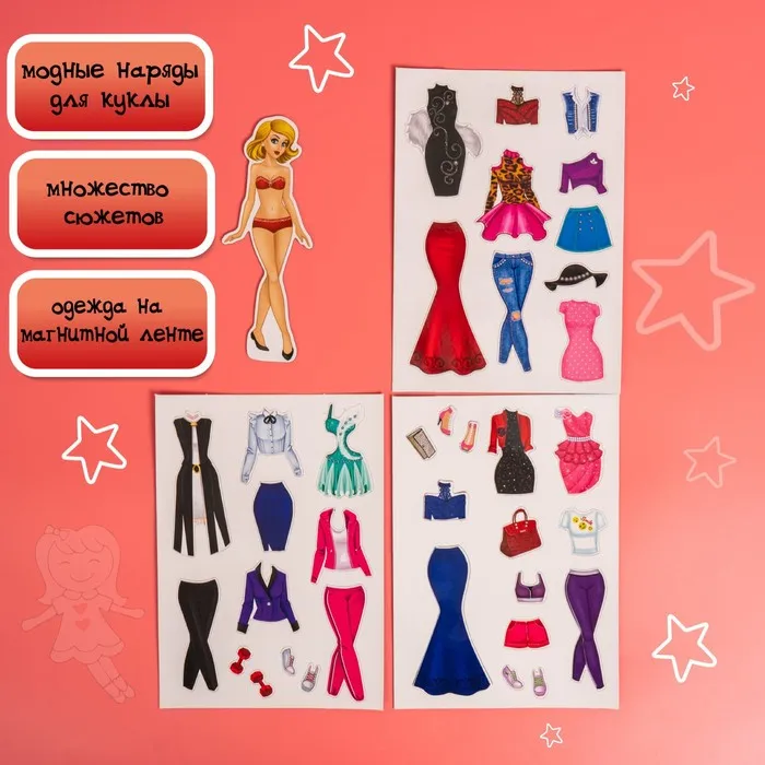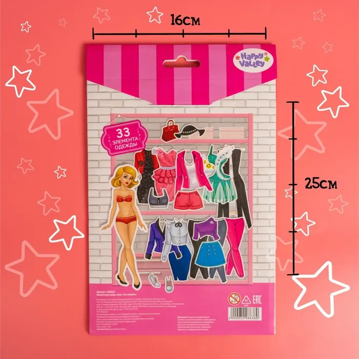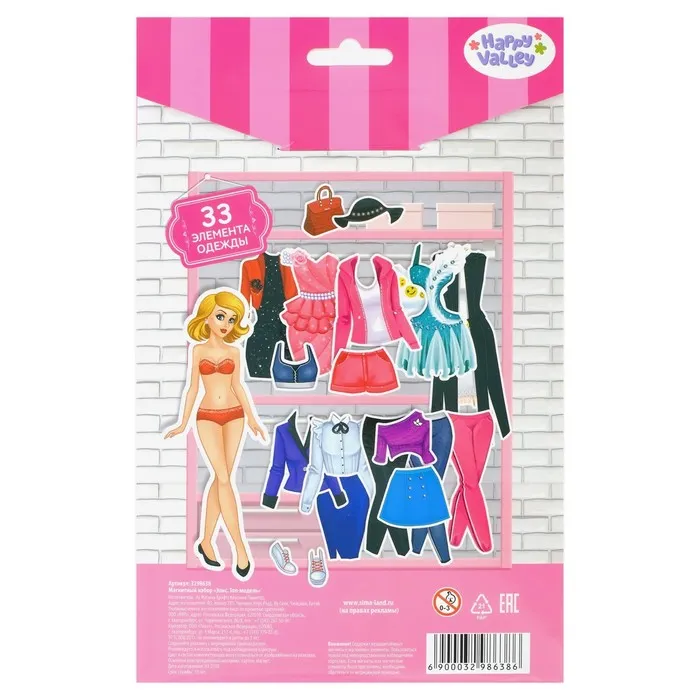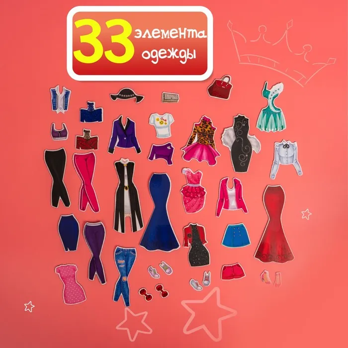 - 33 магнитных элементов: одежда, обувь и аксессуары.