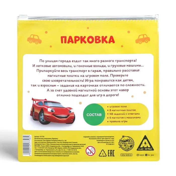 Возьмите карточку с заданием и расположите транспорт на игровом поле так, как на ней указано. В наборе восемь элементов разной формы. Ваша задача — расположить их на доске так, чтобы через отверстия были видны машины, указанные в задании. Попробуйте решить головоломку!