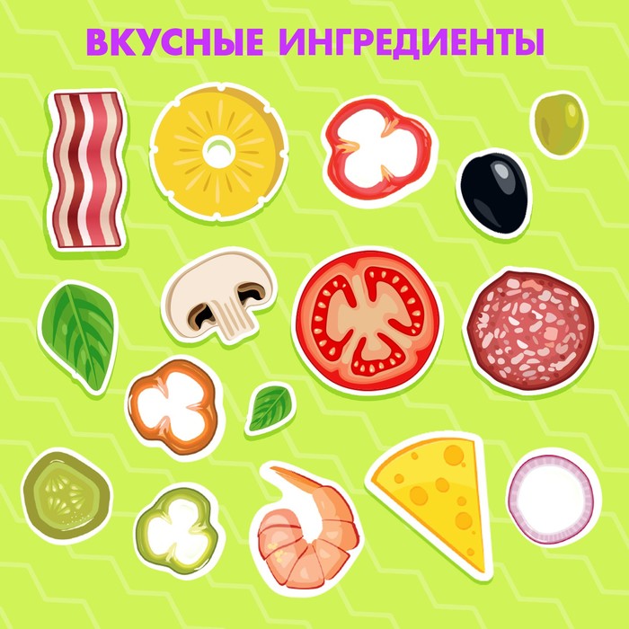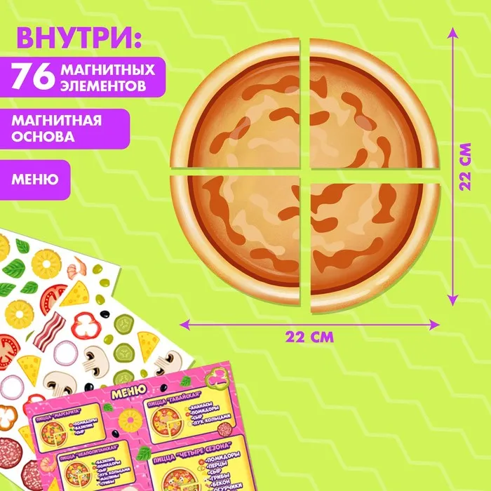 Игровой набор на магнитах «Готовим вместе. Любимая пицца» будет интересен всем, кто хочет попробовать себя в роли настоящего повара и приготовить вкусное лакомство. В представленном наборе имеется магнитная основа для пиццы, ингредиенты (76 магнитных фигурок) и меню.