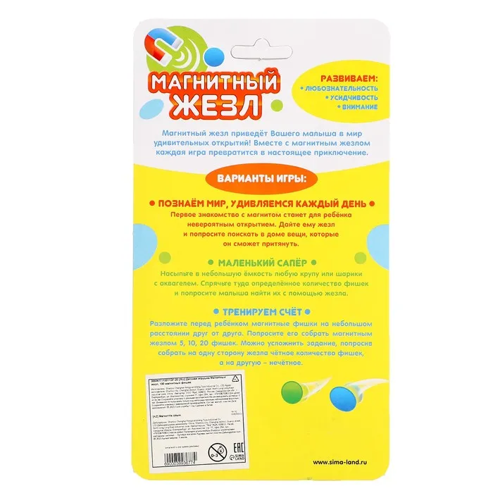 Разложите перед ребёнком фишки на небольшом расстоянии друг от друга. Попросите его собрать магнитным жезлом 5, 10, 20 фишек. Можно усложнить задание, попросив собрать на одну сторону чётное количество фишек, а на другую – нечётное.