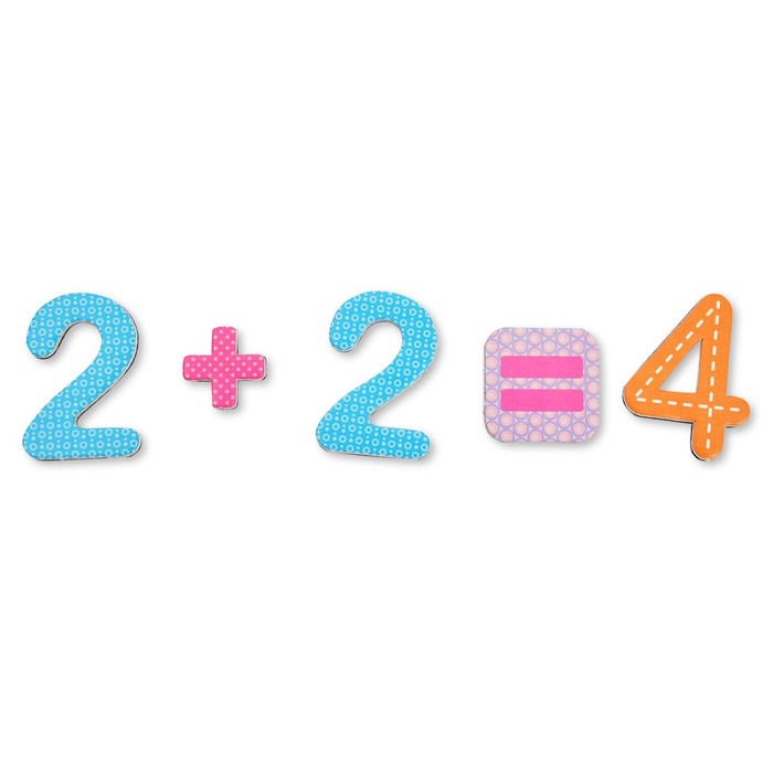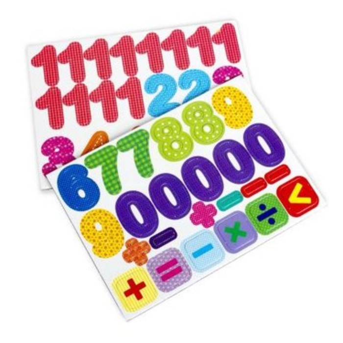 - 45 магнитных элементов — в наборе цифры от 0 до 9 и математические знаки. Ребёнок может составлять примеры на холодильнике или магнитной доске.