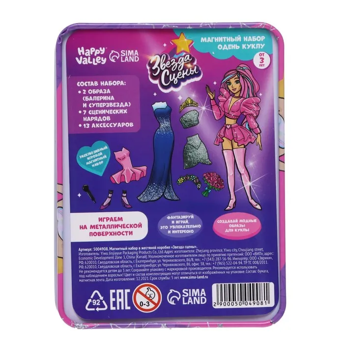 Играть с набором просто: снимите с листа подходящий наряд и аксессуары, а затем приложите их к кукле. Играйте только на металллической поверхности, карточка не магнитная. Одежда прикрепится к модели благодаря магнитной ленте. Отличие этого набора от других — в наличии жестяной коробки, в которую ребёнок сложит все комплектующие игры, чтобы не терять их!