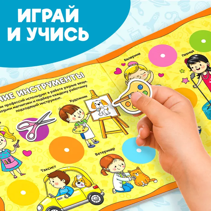 Это не просто книга, а интерактивная игра, которая сочетает обучение и развлечение. Яркий дизайн и множество магнитных элементов делают её идеальным подарком для детей, которые начинают интересоваться миром профессий. Книга надолго увлекает ребёнка, помогая ему развивать фантазию и полезные навыки.