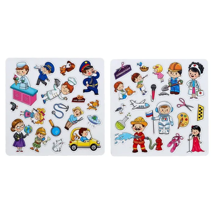 - 35 магнитных элементов для изучения профессий и создания сюжетов.