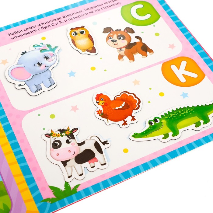 Внутри книги ребёнок найдёт интересные задания, которые нужно выполнять, используя магнитные буквы. Малыш будет составлять слова и узнает все буквы алфавита.