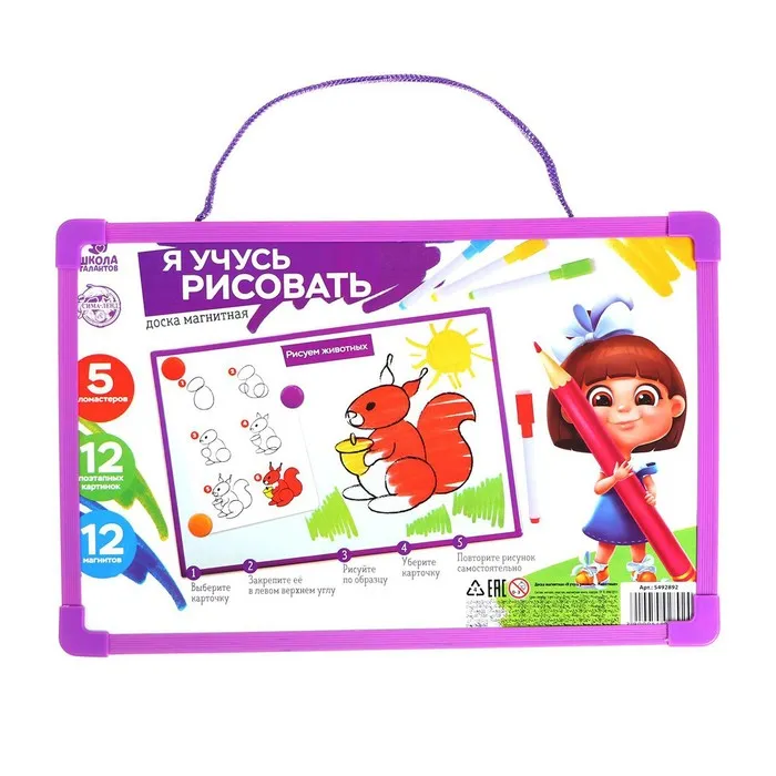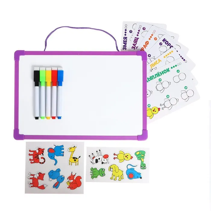 С таким набором ребёнок сможет рисовать свои собственные иллюстрации или попробует повторить рисунок по образцу. С доски легко стереть нарисованное с помощью наконечников на маркерах.