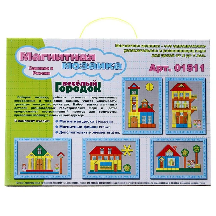 С помощью данного набора ваш малыш выучит названия геометрических фигур, повторит цвета и научится рассказывать истории про персонажей на картинке. Магнитная мозаика «Весёлый городок» учит малыша внимательности, усидчивости, аккуратности, развивает художественное воображение, мелкую моторику, фантазию и логику.
