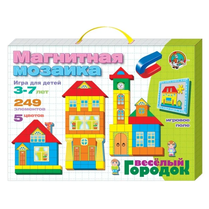 Магнитная мозаика «Весёлый городок» — это прекрасный игровой набор, с помощью которого малыш может собрать большое количество весёлых разноцветных домиков. А дополнительные элементы украсят «весёлый городской пейзаж»!