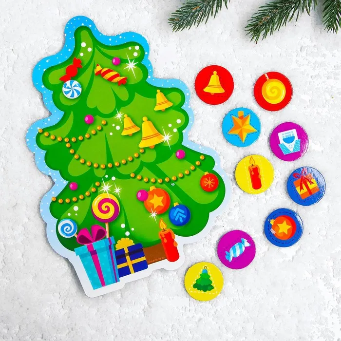 Поместите ёлочку на холодильник или играйте на столе. Попросите малыша украсить ёлку, посчитать игрушки. Используйте магнитные элементы в сюжетно-ролевых играх.