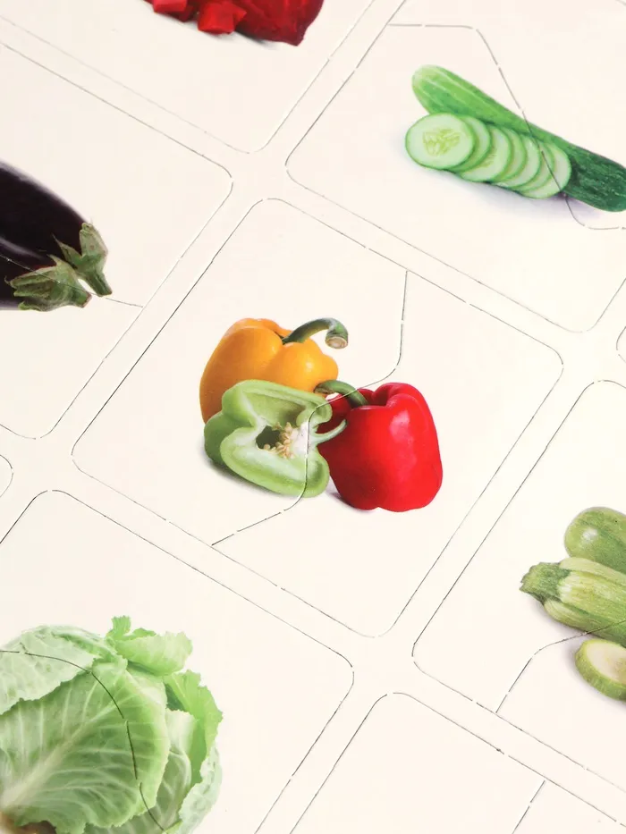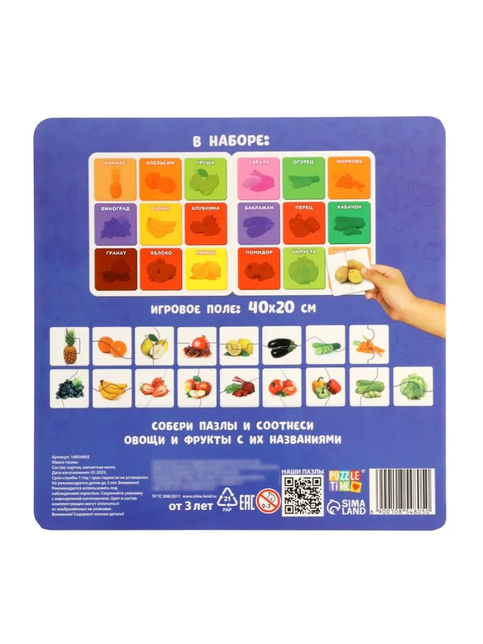 Магнитные пазлы «Фрукты и овощи» — это настольная головоломка для детей от 3 лет. В наборе — 18 парных пазлов (всего 36 деталей), выполненных из картона с магнитной лентой. Игра комплектуется игровым полем с магнитной поверхностью, что делает сборку удобной и увлекательной. Тематика еды помогает ребёнку узнавать новые продукты в игровой форме.