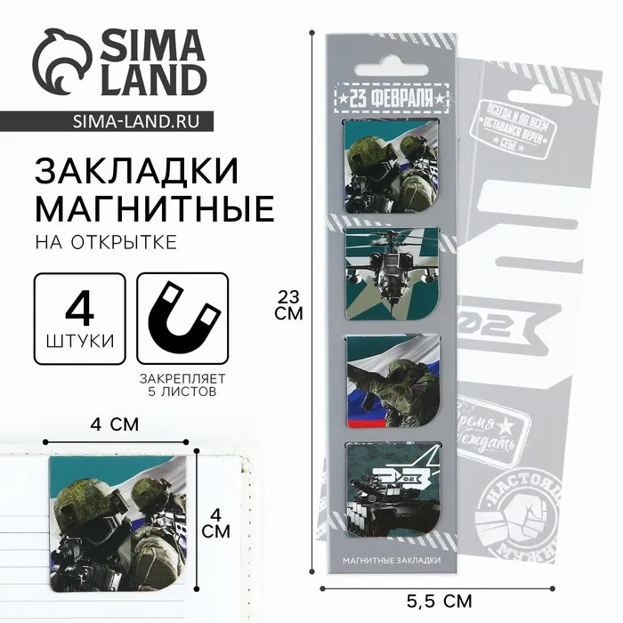 Магнитные закладки для книг, 4 шт. в открытке «С 23 февраля» — Характеристики