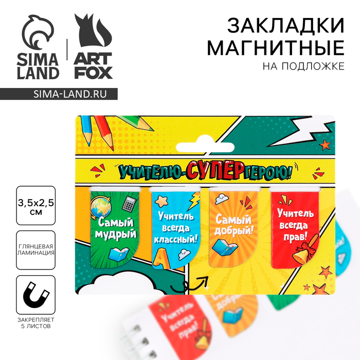 Магнитные закладки для книг, 4 шт. «Учителю-СУПЕРгерою!»